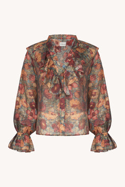 Koszula Marsylia Print z malarskim wzorem w odcieniach ochry, błękitu i rdzy. Elegancki krój z dekoltem „V” i falbanami podkreśla kobiecość i dodaje lekkości. Idealna do codziennych i wieczorowych stylizacji.