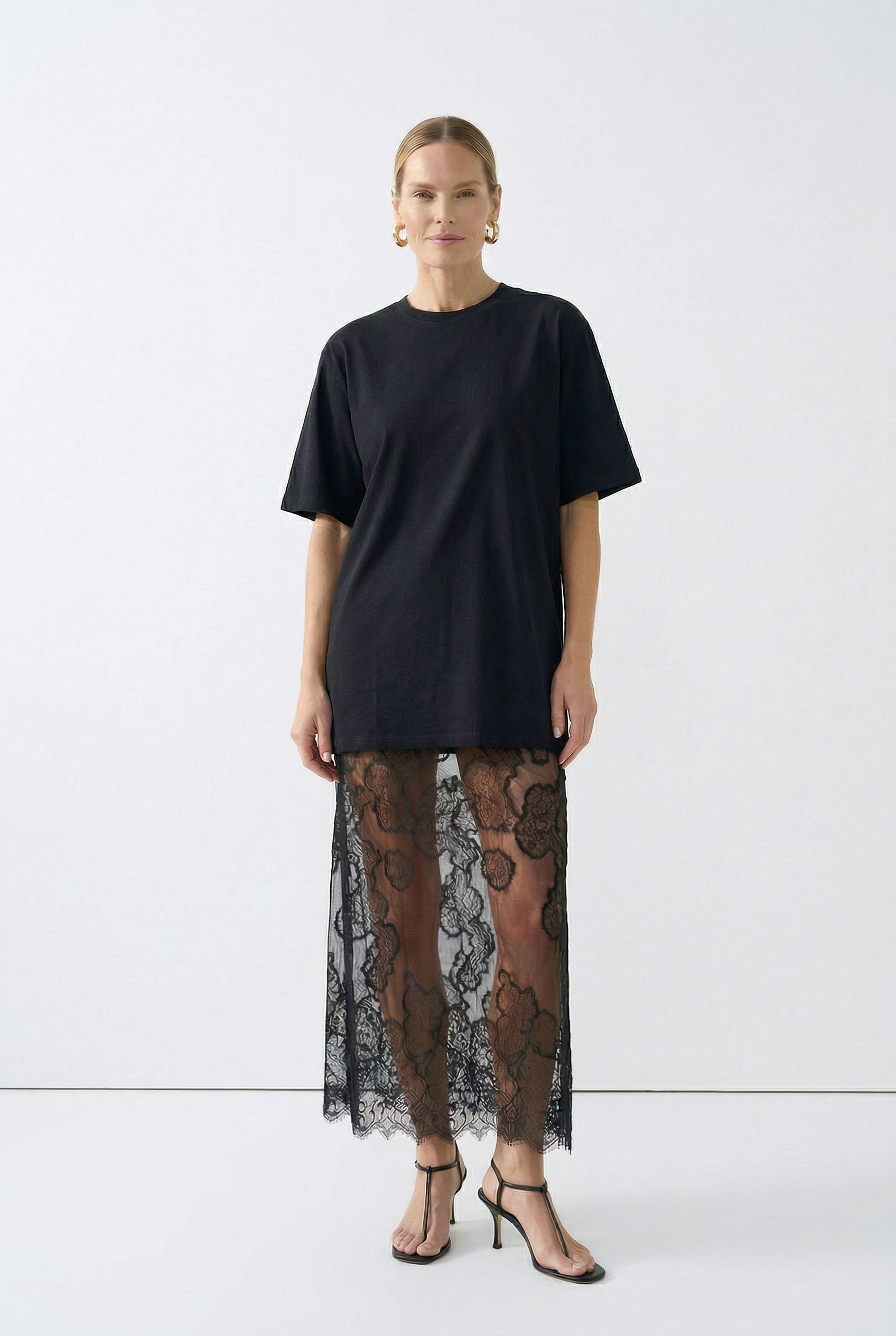 Transparentna spódnica maxi wykonana z wyrazistej, kwiatowej koronki w głębokiej czerni. Lekka, ażurowa struktura subtelnie pracuje w ruchu, nadając sylwetce miękkości i zmysłowego charakteru.