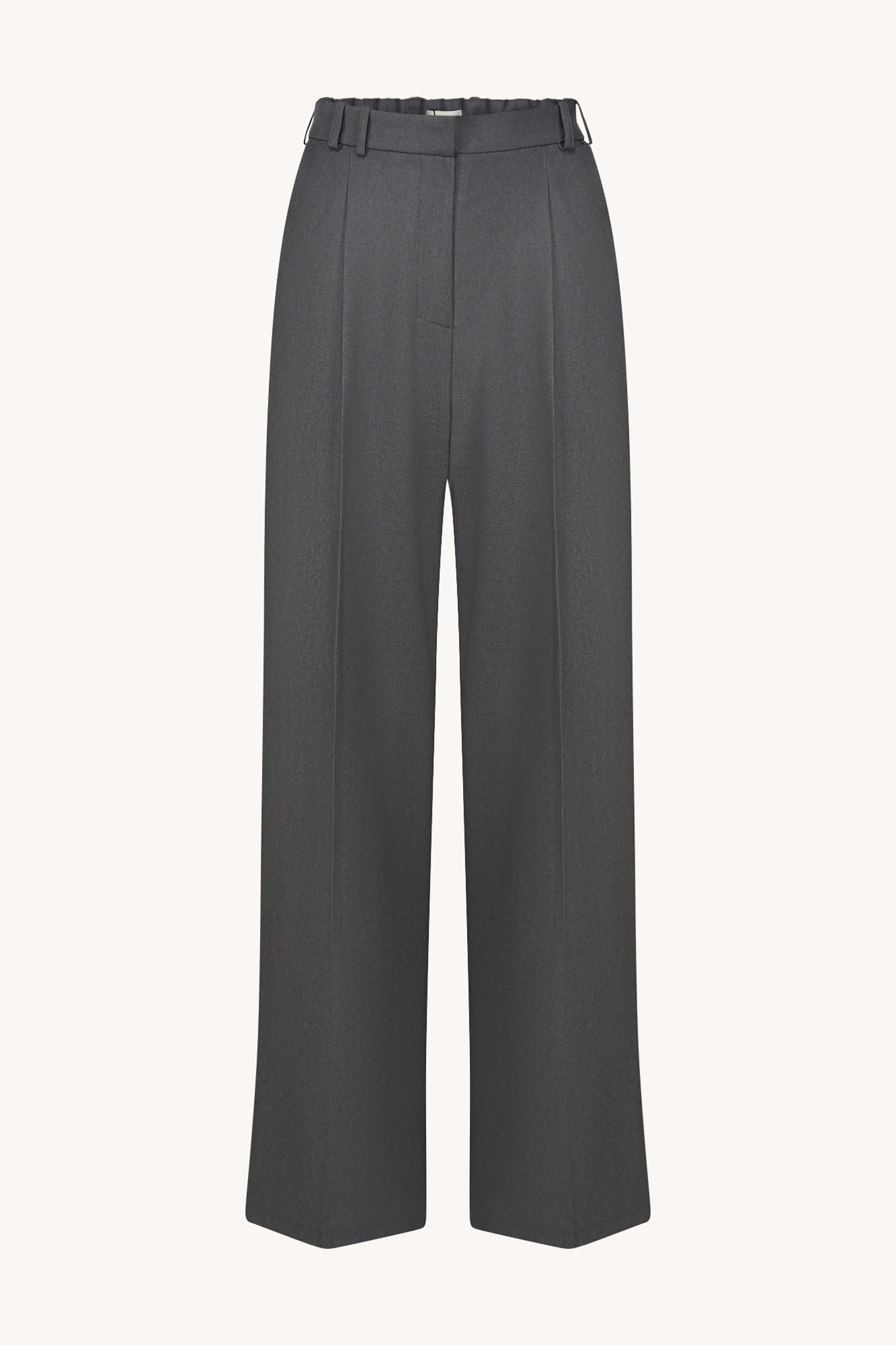 Wełniane spodnie garniturowe o klasycznym, szerokim fasonie z kantem. Wysoki stan optycznie wydłuża nogi, z tyłu wszyta gumka zapewnia komfort noszenia, z przodu zapinane na haftkę. Dwie kieszenie po bokach i jedna z zakładką dodają elegancji i funkcjonalności.
