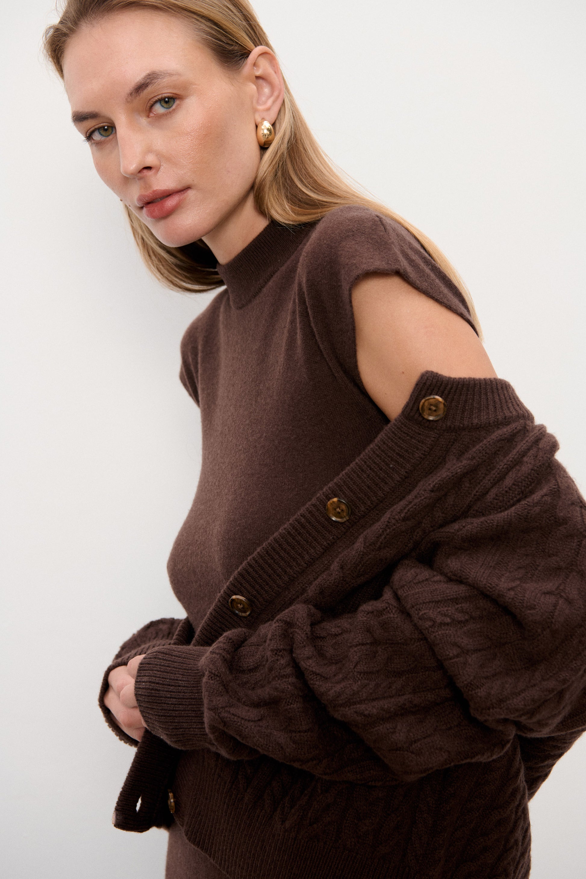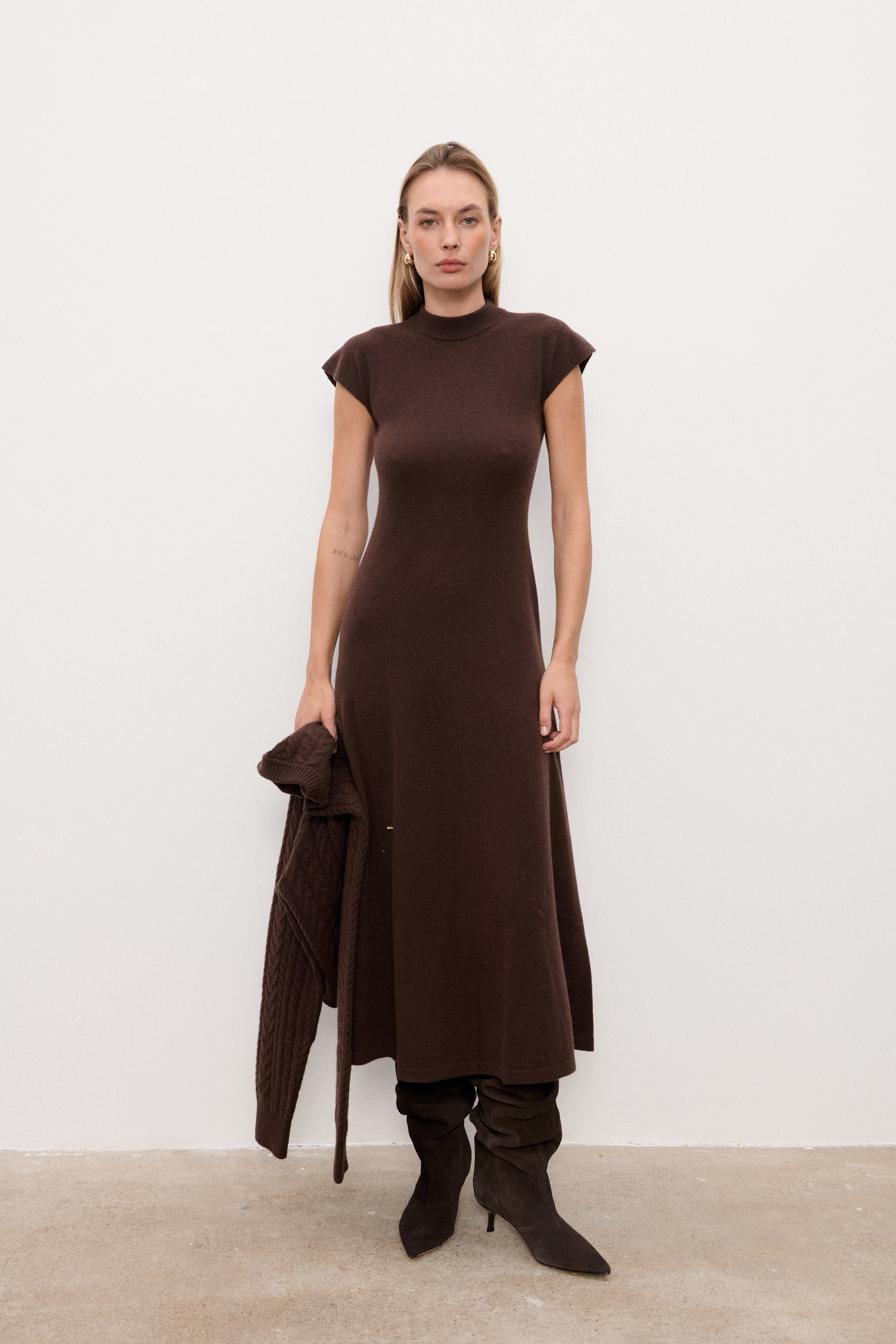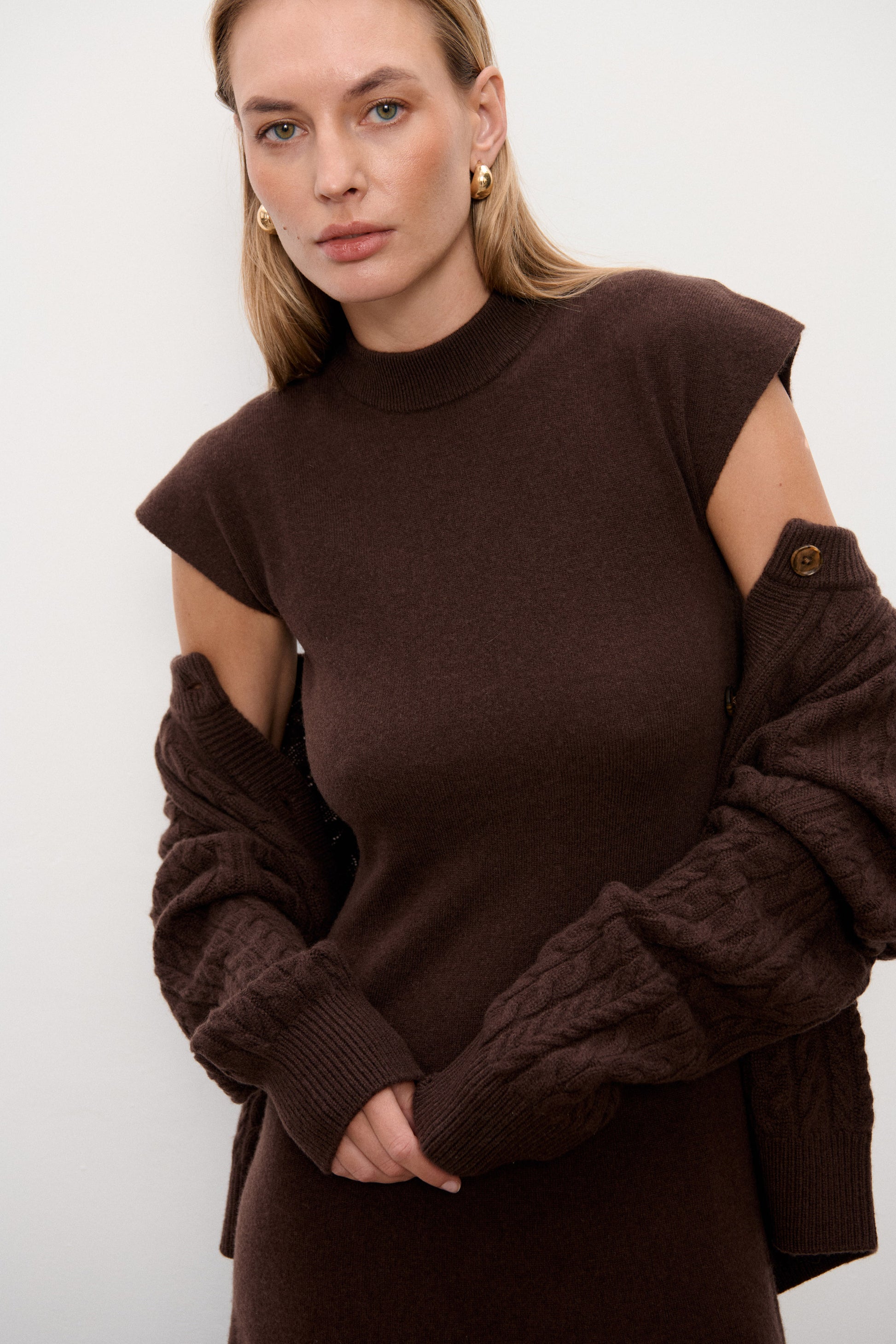 Wykonana z mieszanki wełny merino i kaszmiru, jest miękka, otulająca i idealna na chłodniejsze dni. Dzianinowa struktura sprawia, że pięknie układa się na sylwetce i pozostaje wygodna nawet podczas całodniowego noszenia.