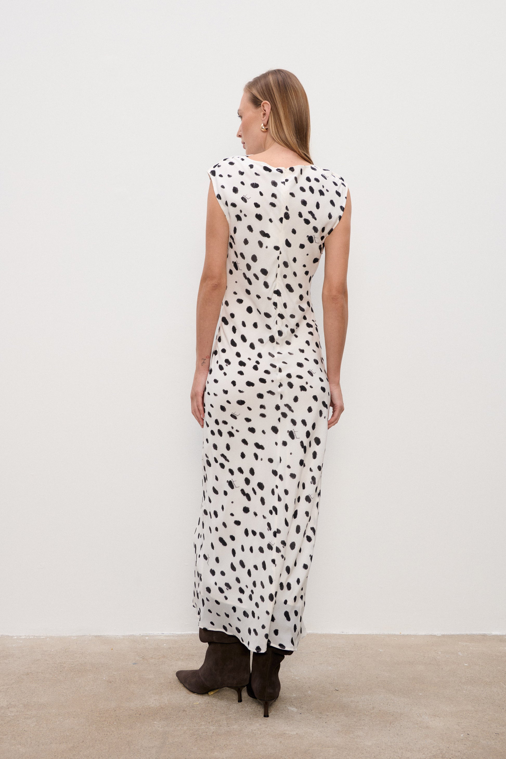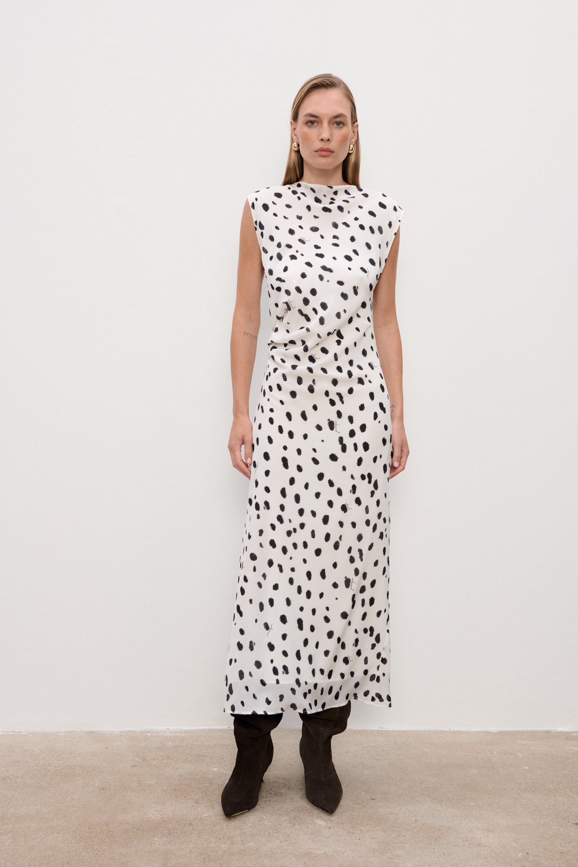 Długa sukienka z jedwabiu w czarno-biały wzór w nieregularne kropki. Ma dopasowany krój, zabudowany dekolt i szerokie ramiączka, które nadają jej nowoczesnego, kobiecego charakteru. Podszewka z wiskozy zapewnia komfort noszenia. Idealna w połączeniu z czarną marynarką lub solo – sprawdzi się zarówno na wieczorne wyjście, jak i na co dzień.