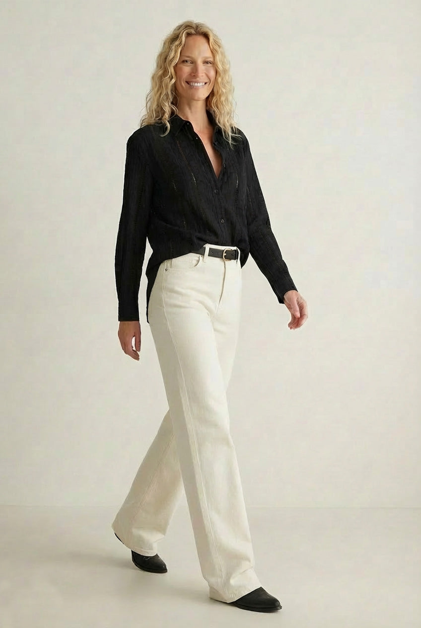 Koszula o klasycznym kroju w kolorze czarnym. Wykonana z przewiewnej, ażurowej tkaniny z dekoracyjnymi przeszyciami. Subtelnie prześwitująca struktura dodaje jej lekkości i wyrafinowania, a klasyczny kołnierzyk i mankiety z guzikami przełamują jej zmysłowy charakter. Świetnie sprawdzi się do codziennych jak i wieczorowych stylizacji.