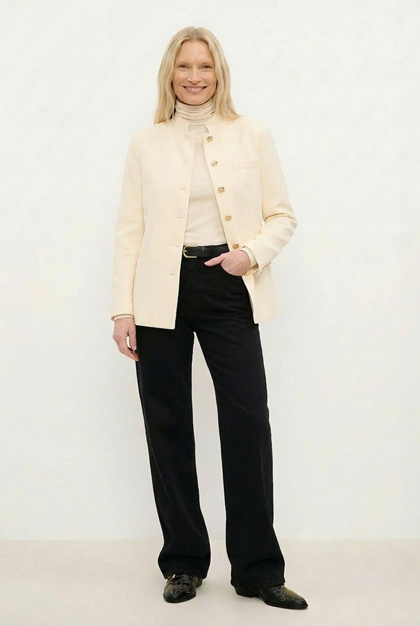 Wełniana marynarka o klasycznym, minimalistycznym fasonie z kołnierzem w stójkę i zapięciem na guziki. Lekka, przyjemna w dotyku i trwała. Beżowy kolor nadaje subtelnej elegancji i uniwersalności, idealnej do codziennych i bardziej formalnych zestawów.