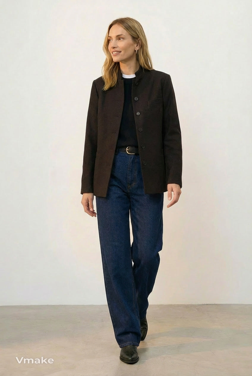Wełniana marynarka o klasycznym, minimalistycznym fasonie z kołnierzem w stójkę i zapięciem na guziki. Lekka, przyjemna w dotyku i trwała. Głęboki brąz sprawia, że świetnie komponuje się z wieloma stylizacjami, tworząc elegancką bazę w garderobie.