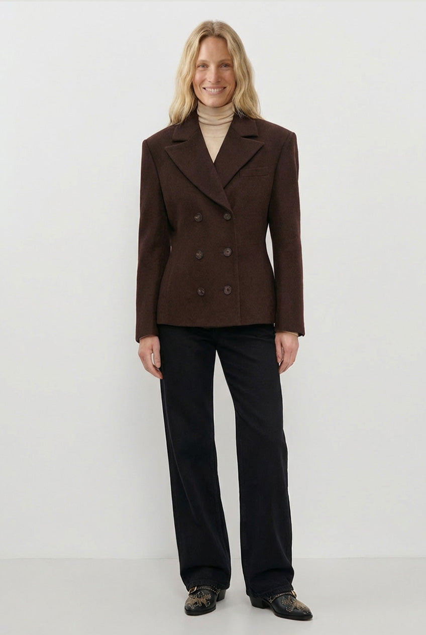 Taliowana marynarka wykonana w 100% z wełny. Klasyczny kołnierz i dwurzędowe zapięcie na guziki podkreślają sylwetkę, a ciepła i przyjemna w dotyku tkanina zapewnia komfort noszenia. Niezbędny element garderoby, który doda elegancji każdej stylizacji.