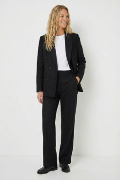 Klasyczna, dwurzędowa marynarka w kolorze czarnym. Posiada wiskozową podszewkę. Model świetnie komponuje się nie tylko z jedwabnymi topami, ale także świetnie wygląda lekko narzucona na sukienkę typu maxi. Tworzy zestaw ze spodniami i kamizelką w tym samym kolorze.