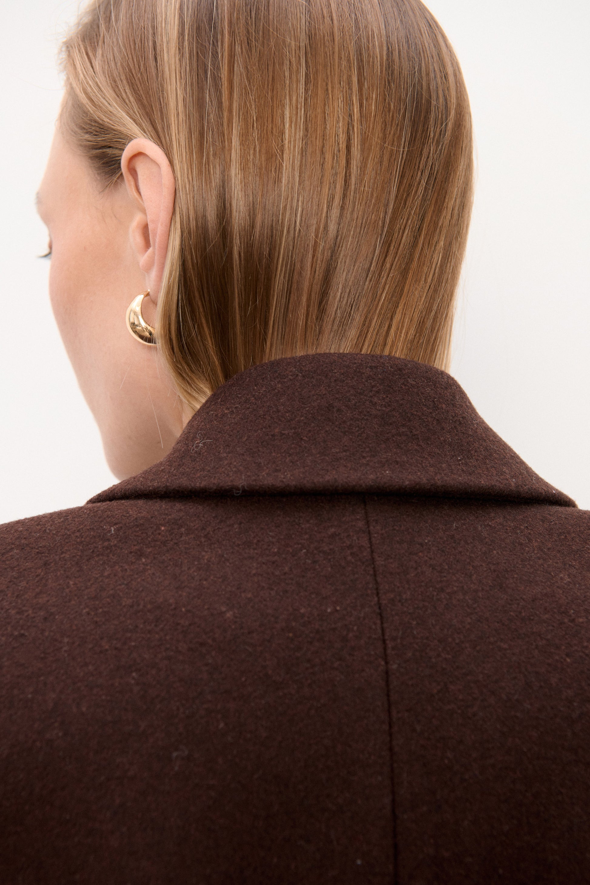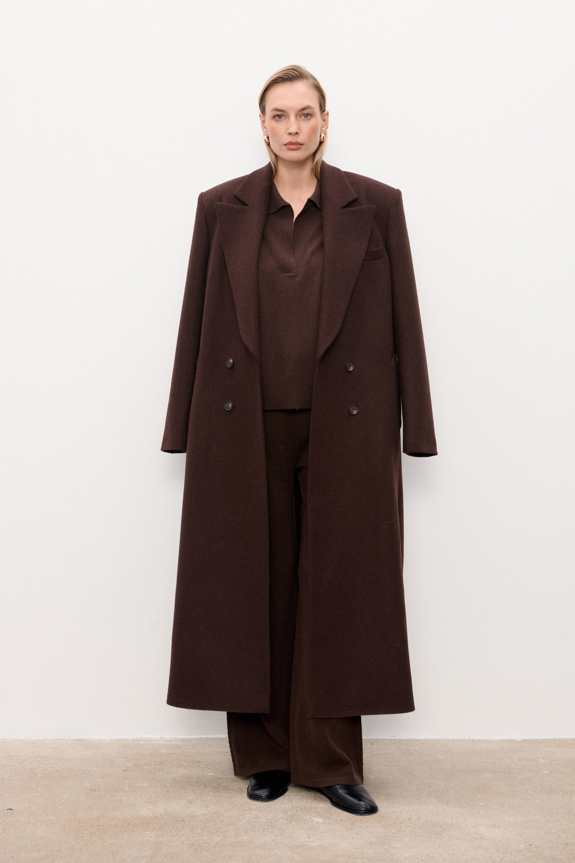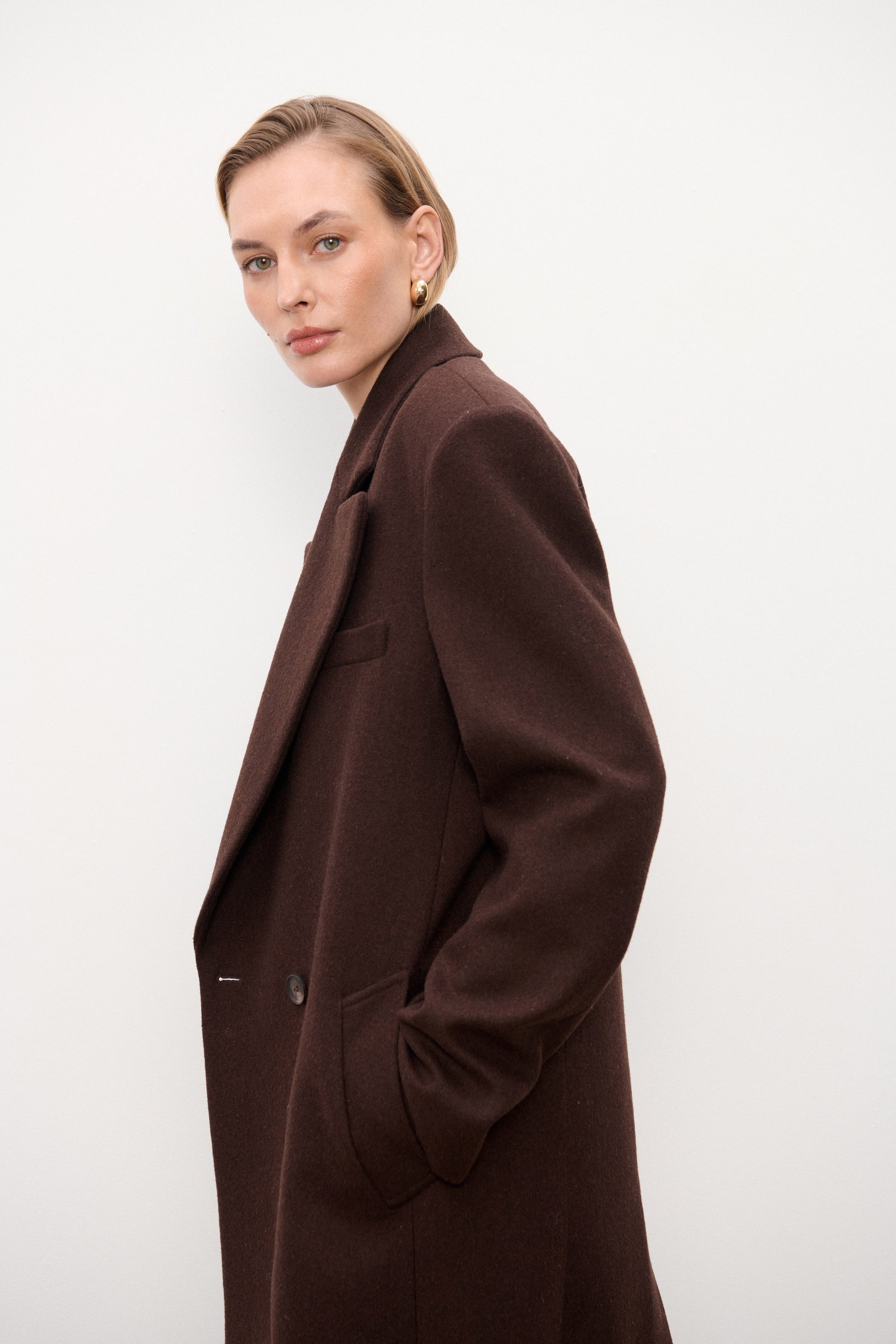 Wełniany płaszcz o eleganckim kroju, z ozdobnym kołnierzem i praktycznymi kieszeniami. Zapięcie na guziki dodaje wygody, a klasyczny brąz wprowadza ponadczasowy, ciepły akcent do każdej stylizacji. Podszewka: 100% wiskoza.