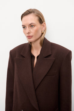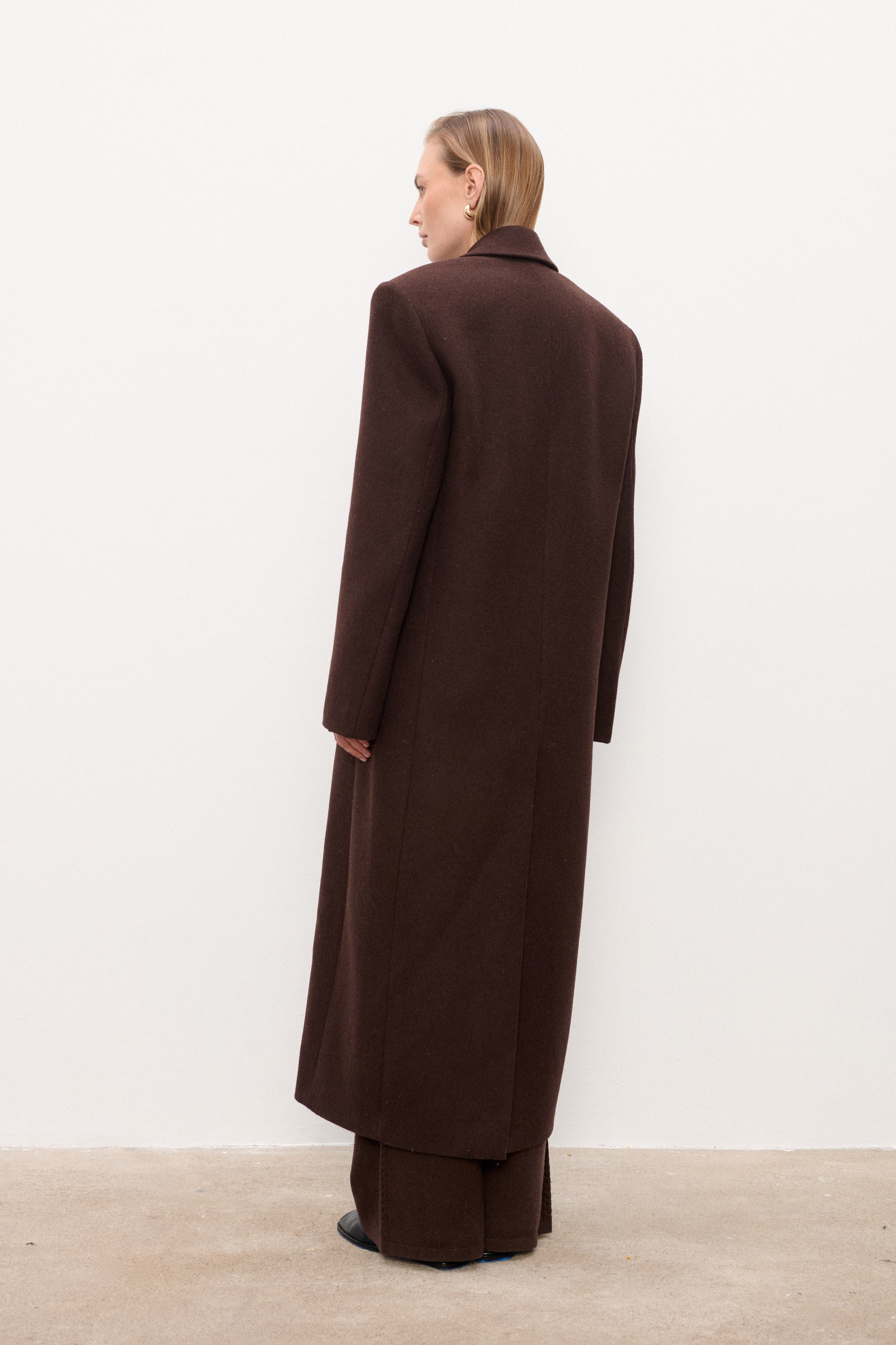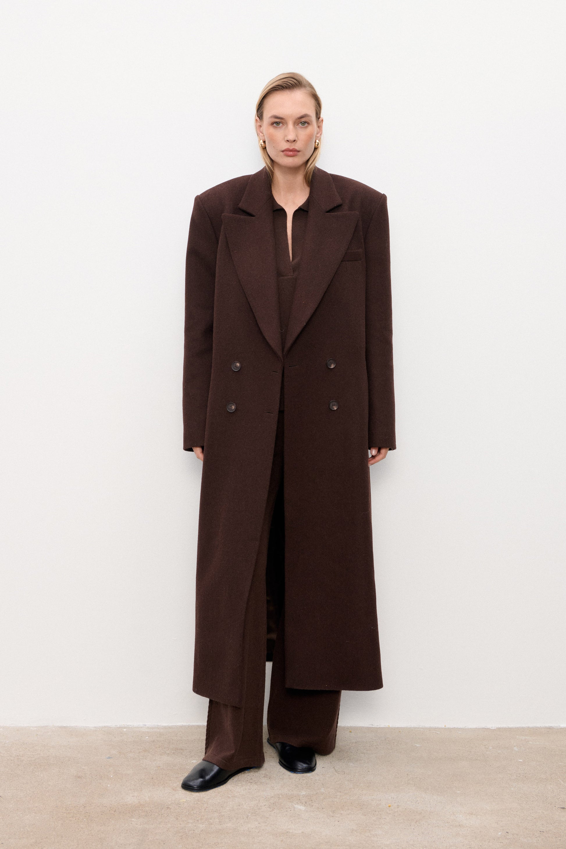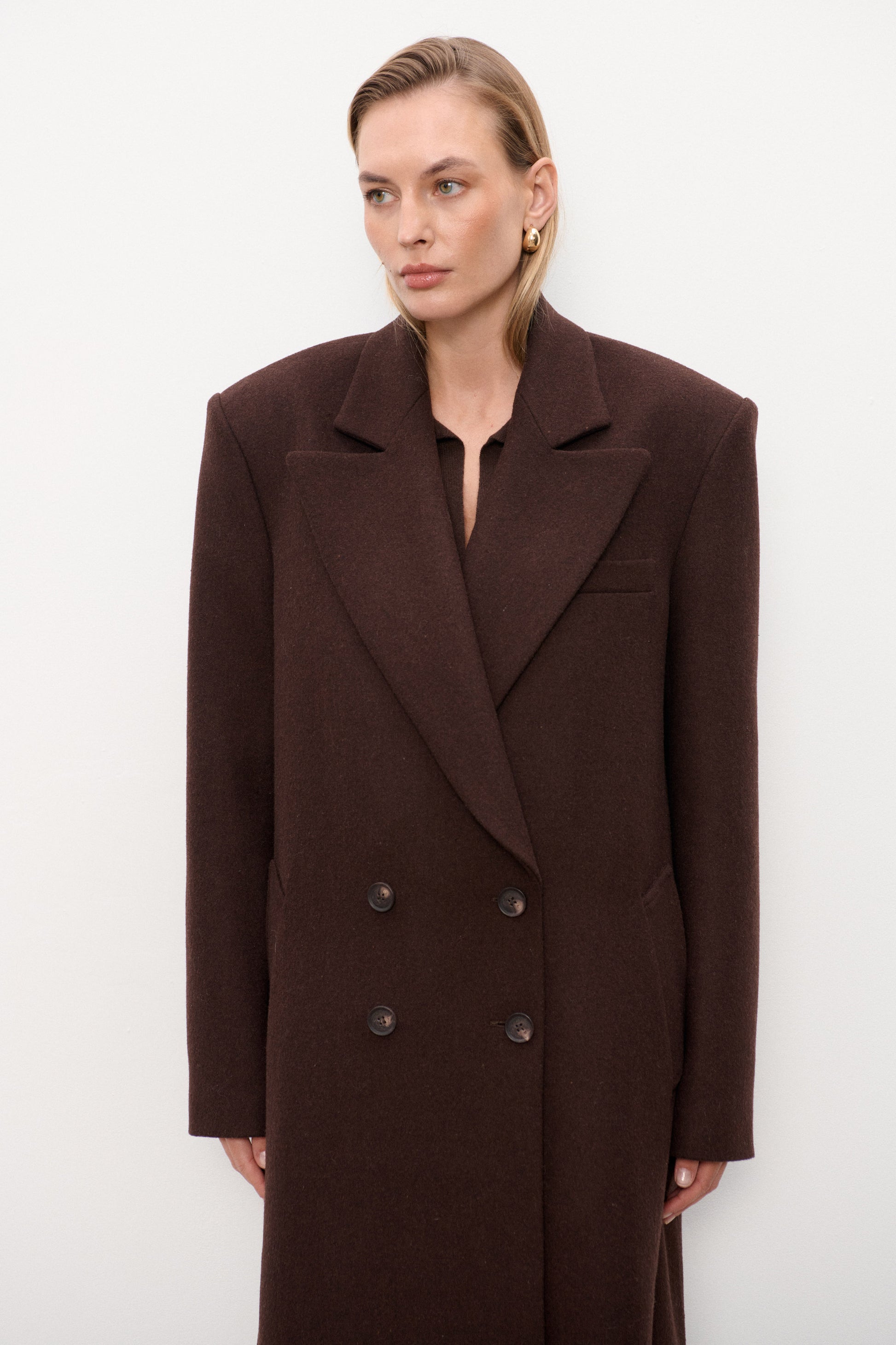 Wełniany płaszcz o eleganckim kroju, z ozdobnym kołnierzem i praktycznymi kieszeniami. Zapięcie na guziki dodaje wygody, a klasyczny brąz wprowadza ponadczasowy, ciepły akcent do każdej stylizacji. Podszewka: 100% wiskoza.