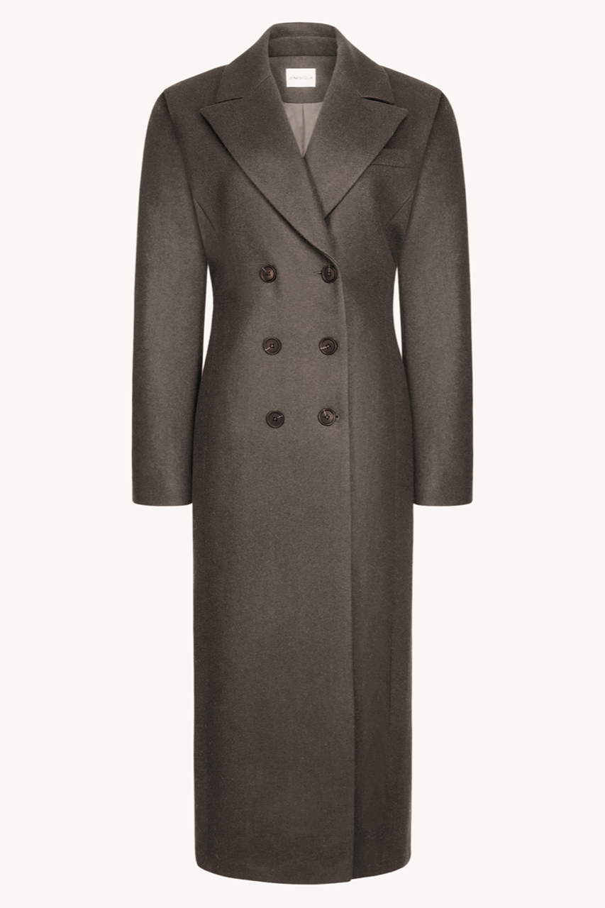 Taliowany płaszcz w popielatym odcieniu, subtelnie podkreślający sylwetkę. Wykonany z wełny, ciepły i wygodny, z klasycznym kołnierzem i dwurzędowym zapięciem na guziki. Ponadczasowy element garderoby na wiele sezonów.