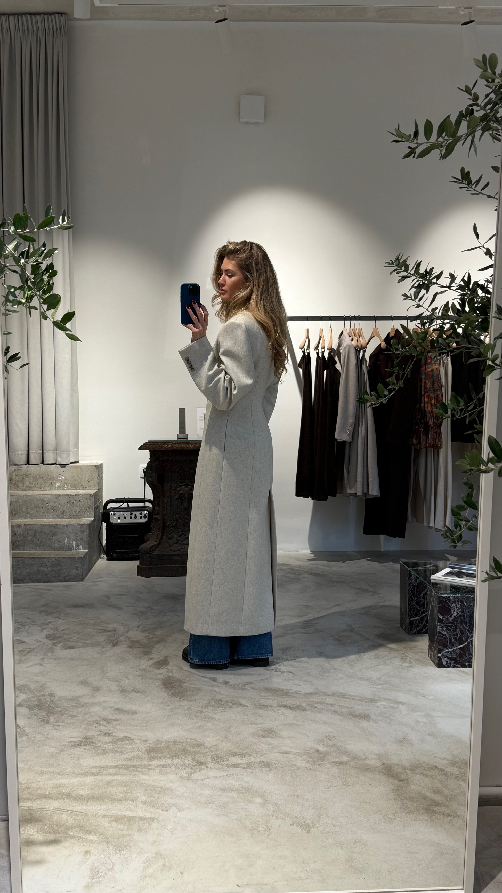 Taliowany płaszcz w eleganckim, neutralnym odcieniu beżowym. Wykonany z wełny, ciepły i wygodny, z klasycznym kołnierzem i dwurzędowym zapięciem na guziki. Ponadczasowy element garderoby, który posłuży przez lata.