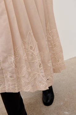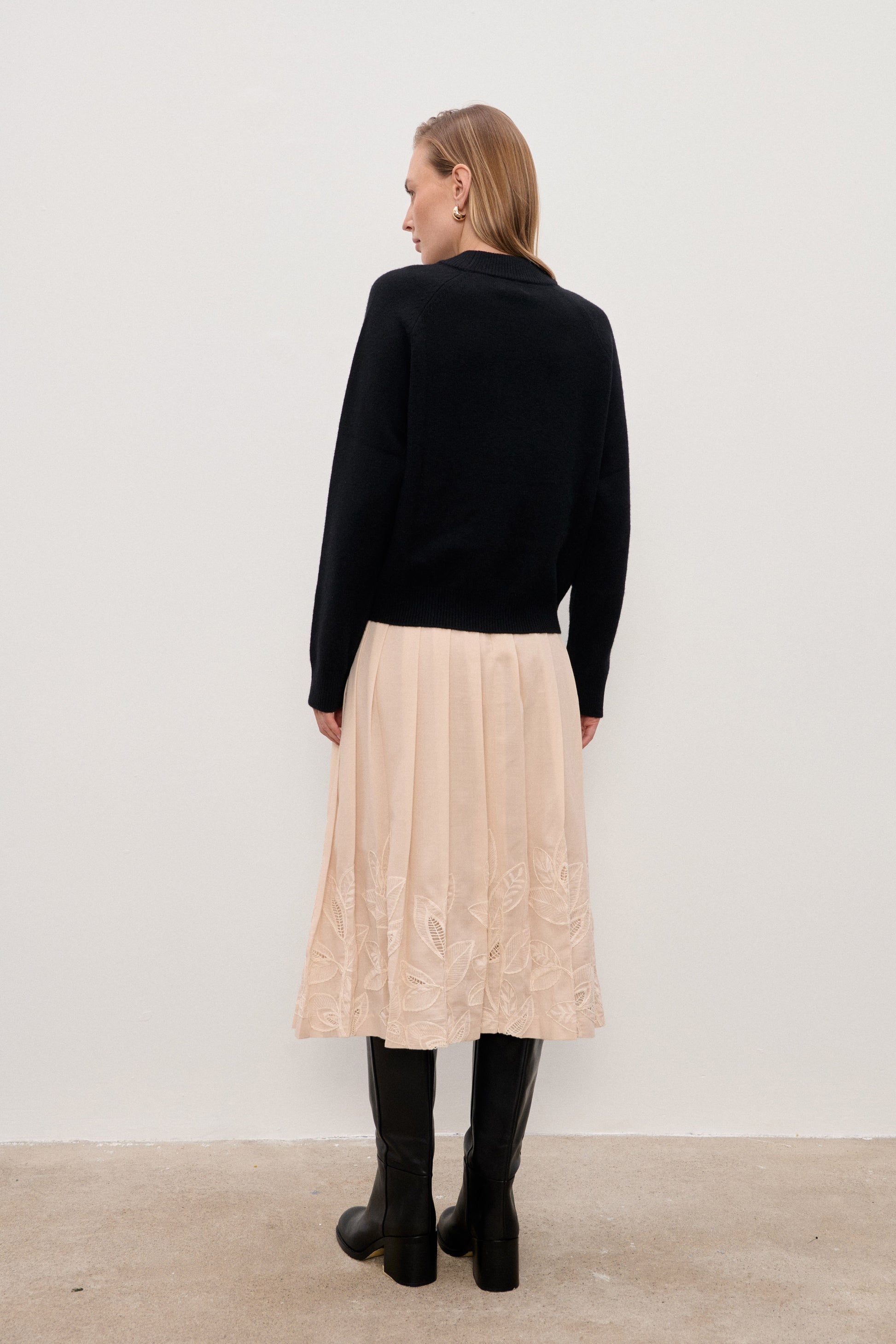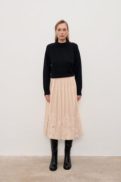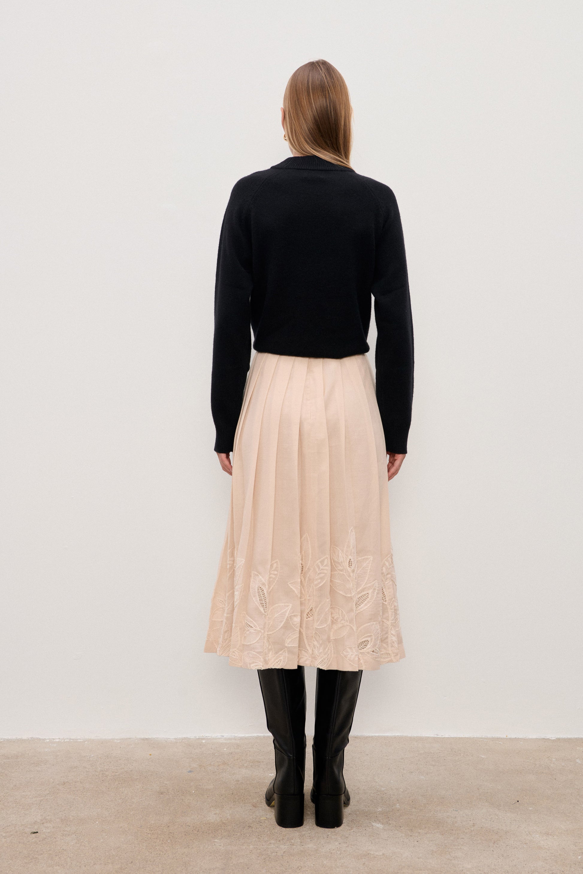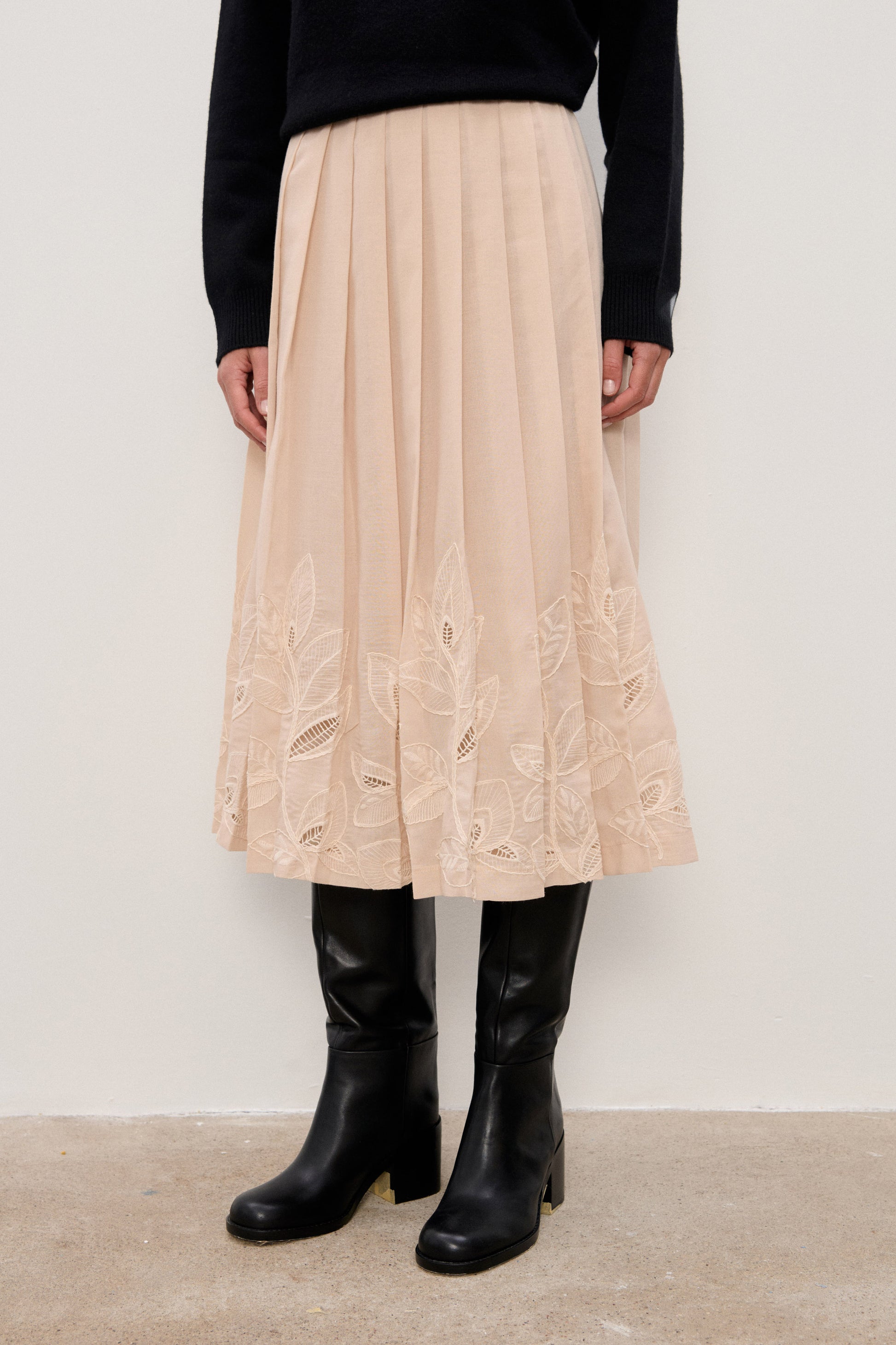 Plisowana spódnica za kolano z ozdobnym haftem u dołu. Uszyta z tkaniny z domieszką bawełny i wiskozy, z podszewką ze 100% wiskozy. Wygodna i elegancka, sprawdzi się w wielu stylizacjach.