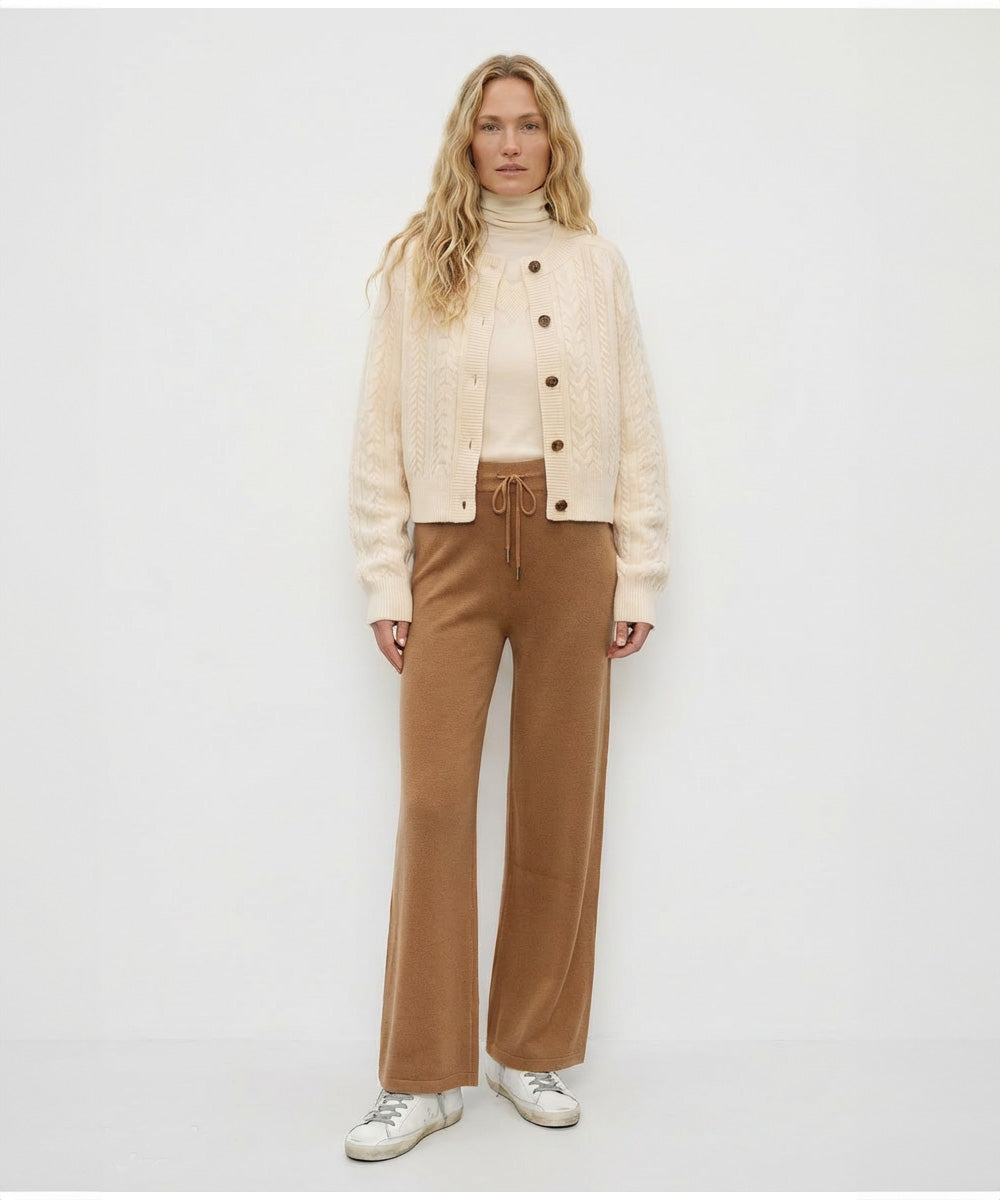 Spodnie Emma Camel to nowoczesne podejście do codziennego komfortu. Wykonane z mieszanki wełny merino i kaszmiru, są miękkie, przyjemne dla skóry i idealne na chłodniejsze dni.