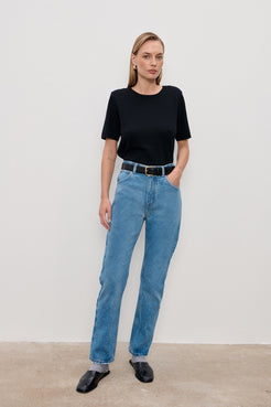 Jeansy o prostych nogawkach 7/8 i wysokim stanie, które subtelnie podkreślają sylwetkę i dodają stylizacji lekkości. Wykonane ze 100% bawełny, są wygodne i oddychające – idealne na co dzień. Klasyczny, niebieski odcień, zapięcie na suwak i cztery kieszenie sprawiają, że to model, który nigdy nie wychodzi z mody.