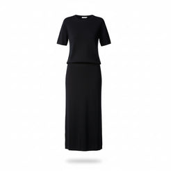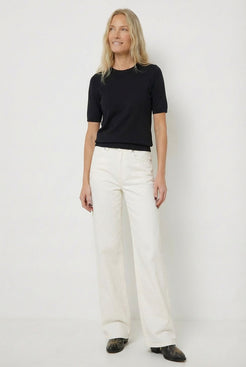 Klasyczny T-shirt z krótkim rękawem o pudełkowym kroju. Wykonany z wełny merino w kolorze czarnym. Posiada okrągły dekolt. Idealny jako element szafy kapsułowej. Stanowi zestaw ze spódnicą w tym samym kolorze.